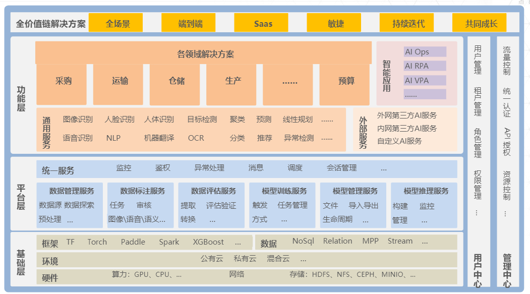 基于语音、语义,视觉,机器学习,强化学习,线性规划等算法,在AI智能平台上,实现各类AI应用场景,提供端到端应用,为客户带来AI落地能力提升、效率提升等