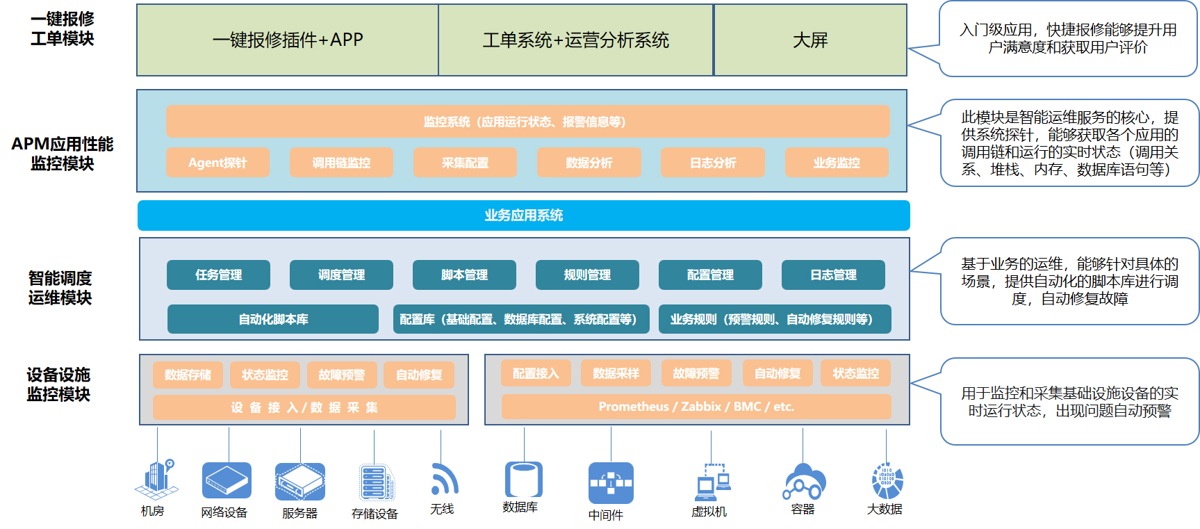 通过构建覆盖IaaS、Paas、SaaS的智能运维平台,为企业提供智能化的监控、预警、问题根因定位等服务;平台由四大模块构成:一键报修工单模块、APM应用性能监控模块、智能调度业务运维系统、设备设施监控系统,各模块可自由选配和组合,为用户提供灵活的解决方案。